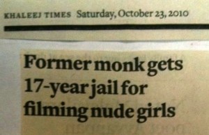 Before boarding my flight home from Dubai last Saturday, I picked up a copy of the Khaleej Times — the English language newspaper published in the UAE. As I leafed through the pages of the newspaper, I came across an article that caught my attention: Former monk gets 17-year jail for filming nude girls. The story was about a thirty-seven year-old Buddhist monk from Cambodia who had secretly filmed two teenage girls as they bathed naked at a temple and more than six-hundred women doing the same. This high-tech monk then shared the footage with others via mobile phones. I have seen lots of Buddhist monks on my travels throughout Asia, many of whom had mobile phones. It is somewhat ironic to see these ochre-clad mendicants chatting on mobile phones — a questionable practice for those who are not supposed to own anything.