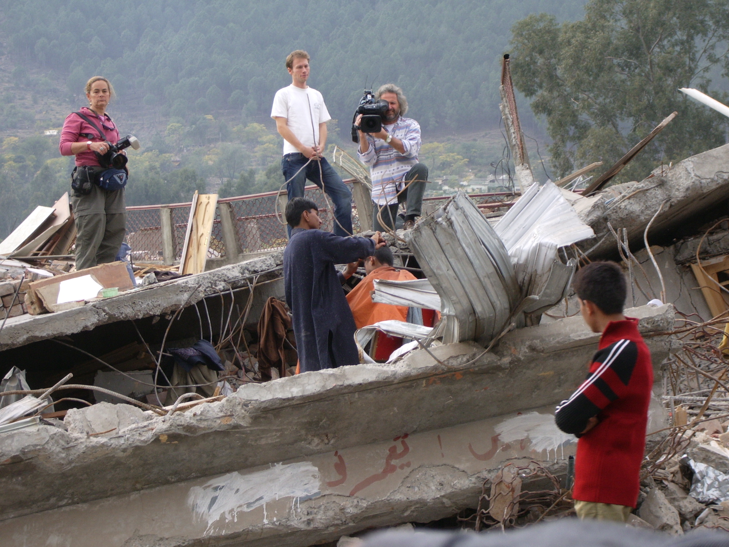 Man getting haircut in rubble after earthquake. | 2005 | Balakot, Pakistan