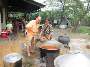 Today was our final day of our Vacation Bible School at the Imparting Smiles orphanage in Poipet. As expected, even more kids showed up this morning in bare feet, some in bare bottoms, but all of them expecting to have a great time. Every square inch of the Imparting Smiles campus was covered with mud and laughter. At the conclusion of our session this morning, we invited the kids and their parents to stay for a meal. The cooks at the center prepared mounds of white rice and a local favorite — some kind of chicken soupy dish that contained absolutely every part of the chicken, including the feet (a favorite delicacy). The only thing I can compare it to is South Texas menudo, a tripe stew that I never learned to like. For the vast majority of those present, this was one of the few times they enjoyed a meal with any kind of meat. Most of the poor people in this area can’t afford meat so their diet consist of mainly rice and vegetables. I was a little amazed at how many of these kids took the time to say thank you for the meal, something we don’t often hear from our kids in America.