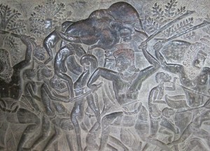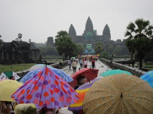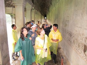 I personally believe that visitors to Cambodia should, at the least, visit the Angkor temples and also the Tuol Sleng Genocide Museum (also known as S-21) and the Choeung Ek killing field in order to get a sense about two important periods of Cambodian history. Today, I took our team of ladies to visit Angkor Wat and Bayon, just two of the many temples in what is the largest religious complex in the world. We slogged through the relentless rain and puddles in order to learn a bit more about the history of the Cambodian people. It was well worth the effort and inconvenience. Our tour guide gave us helpful insight into the history of Cambodia as recorded in the extensive bas-reliefs that have survived through the centuries. The unvarnished history lessons carved in stone tell amazing stories that weave both the political and religious history of Cambodia. Some believe that Pol Pot’s torture methods were inspired by some of the graphic depictions of torture preserved in stone.
