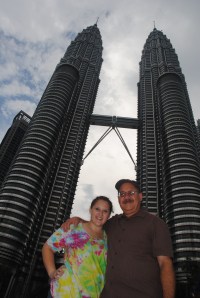 At lunch, Gina and Abby took me to the place where Wilson had brought them for their first lunch in Malaysia — a place called Old Town White Coffee. And then, after a bit of shopping, we traveled by cab to downtown Malaysia to see the Petronas Twin Towers, the tallest twin towers in the world. Magnificent architecture. Once again, as Gina and I posed to have our picture taken, she said to me, “Daddy, I can’t believe you’re here…” And then, we traveled by cab to the night market to meet some students. Gina wanted me to experience the crowds and the energy (and the unusual smell of stinky tofu) of this market that is only open on Wednesday evenings. As we slowly ambled through the crowded outdoor market the skies opened up and it started to rain. Without missing a beat, Gina turned to me and smiled as she said, “Daddy, I can’t believe your here, standing with me in the rain…”