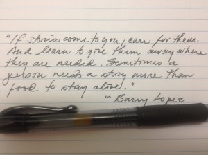 It’s great to finally be on the road with Dad. I was as restless as a kid on Christmas Eve last night and could not sleep. So, I turned on the light and started looking through some of my late mother’s books. My beautiful mother loved to read and wrote lots of notes that she tucked between the pages of the books that she was reading. We are still finding her hand-written notes here and there. Last night I found a note she had written and tucked into one of her books. This was not just any note, it was exactly the note I needed to read and one that reaffirmed my determination to collect more family stories. My mother had written something she had read in “Crow and Weasel”, a fable by essayist, author, and short-story writer Barry Lopez. The quote: “If stories come to you, care for them. And learn to give them away where they are needed. Sometimes a person needs a story more than food to stay alive.” I love this quote. It sums up what I intend to do — to care for the stories that come to me and to give them away where they are needed. Mom’s note also reminded me that I need to live responsibly because someday someone might give away a story from my life. When that happens, I sure hope that it will give hope and encouragement to those who hear it.