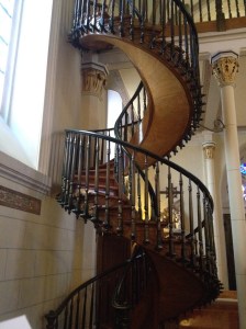 After worship, Dad and I walked over to Loretto Chapel, an old church with a fascinating history. A design flaw was discovered when the chapel was nearing completion in 1878 — there was no way to get from the chapel floor to the choir loft. The Sisters of Loretto consulted local carpenters but, because of the height of the loft, they each concluded that a conventional staircase would take up too much room in the chapel below. Using a ladder or rebuilding the balcony seemed the only options, both unsatisfactory solutions. So, the Sisters of Loretto spent several days in prayer, seeking divine guidance. According to legend, a mysterious carpenter arrived on the final day of their prayer vigil. The only tools he had with him were a saw, a carpenter’s square, a hammer, and some tubs in which to soak wood. This carpenter designed and built a circular staircase to the choir loft. The staircase has 33 steps and rises 20-feet in two full 360-degree turns with no visible means of support. It is held together by a system of square wooden pegs. It took this mysterious carpenter six-months to build the staircase and then he vanished without pay when he had finished his work.