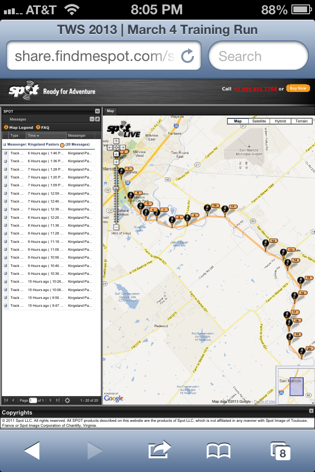 A: Yes. We are hoping that many of you will make it to some of the checkpoints along the course. And we will also have a Spot Tracker during the race that will send our position every few minutes to an online map that you can follow on your smart phone or computer. Also, my daughter Niki who will serve as our team captain has set up a Lone Star Pastors (our team name) Facebook page where she will post our video updates recorded at checkpoints during the race.