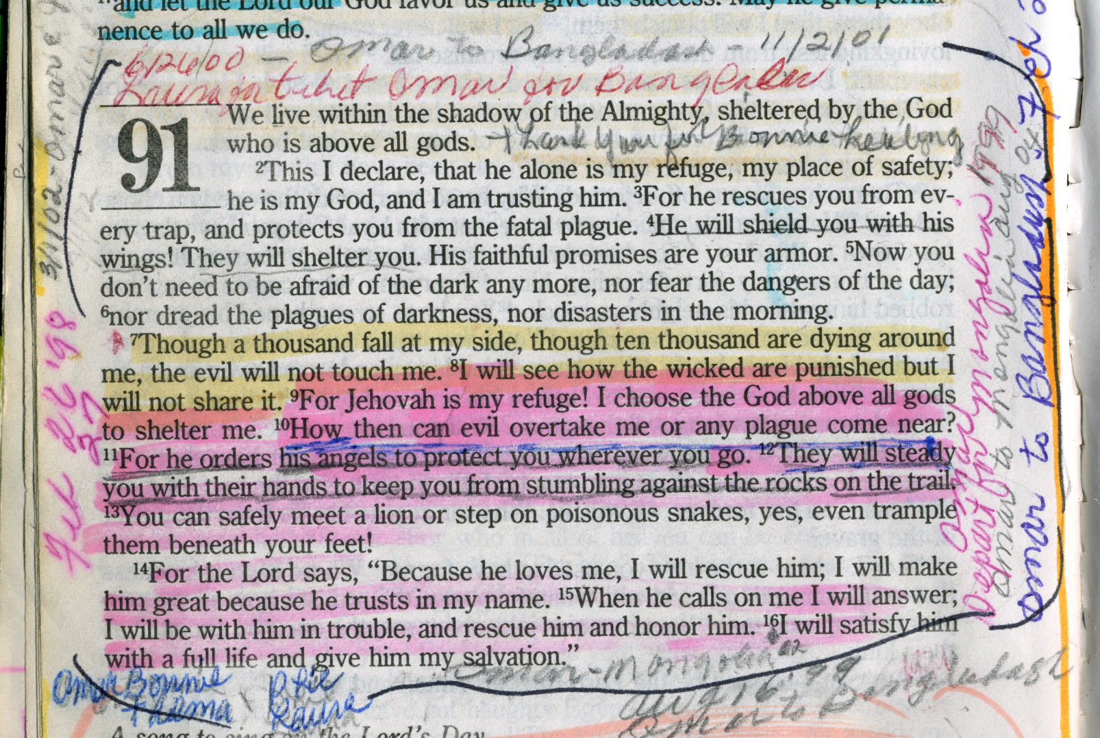 I always knew that Mom prayed for my safety and success on my travels, but I never knew that she was recording these things in her Bible. It’s no wonder that I have survived so many occasions when I have been in danger in remote locations around the world. Mom kept me tethered to safety by her prayers. She had also noted the dates I had called home from overseas and initialed these notes with the letters TYL — Thank You Lord. Mom recorded several of my trips around Psalm 91, perhaps because the theme of this psalm is security and how God preserves those who abide in Him and love Him.