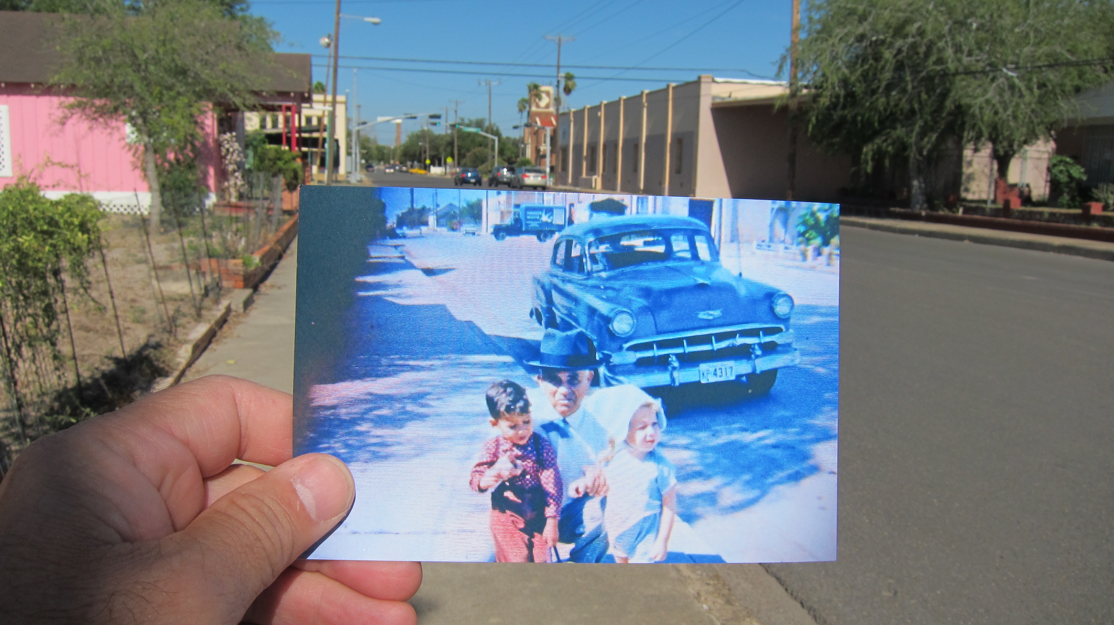 Today, Dad and I drove from McAllen to the neighboring town of Mission where I was born. We stopped by the cemetery to visit Mom’s grave and then drove to the street where my grandparents had their first home. I had an old photo with me that recently surfaced of my grandfather with my sister and me on the sidewalk in front of their home. I held it up at the very spot where it was taken in 1959 and took a picture of it, juxtaposing the old with the new. While the passage of time has changed the neighborhood, it has not diminished the memory of happy times there with my grandparents.