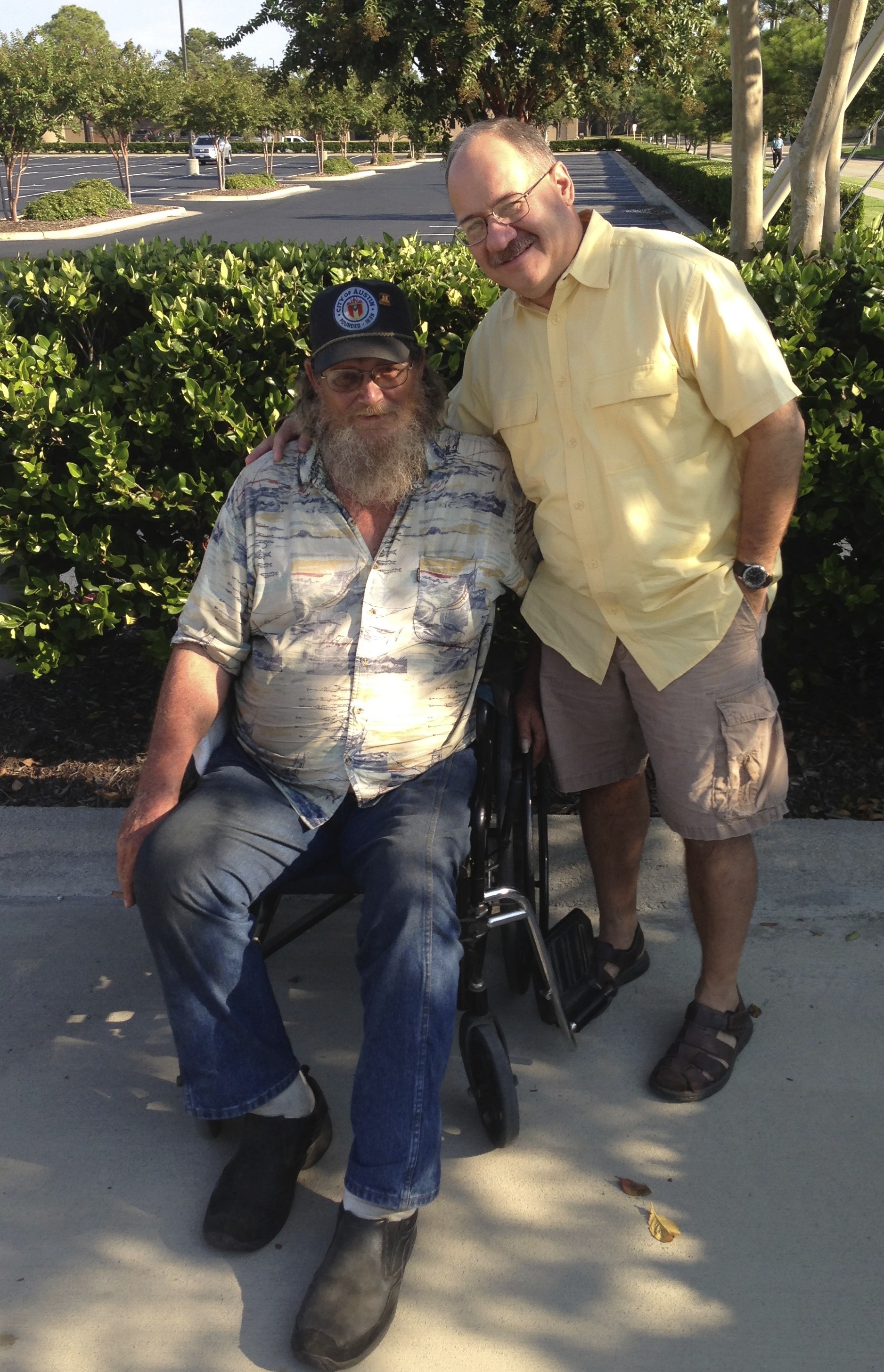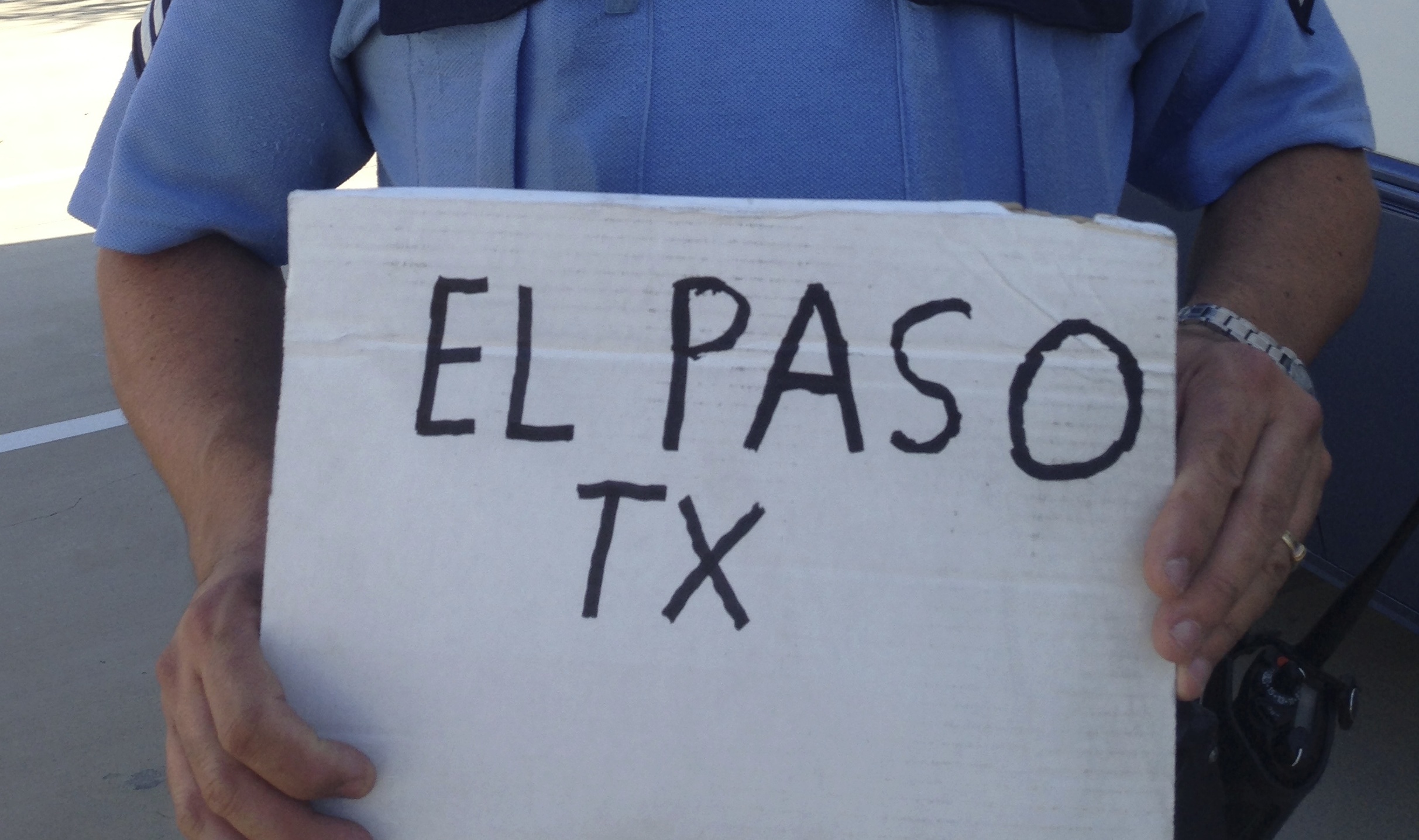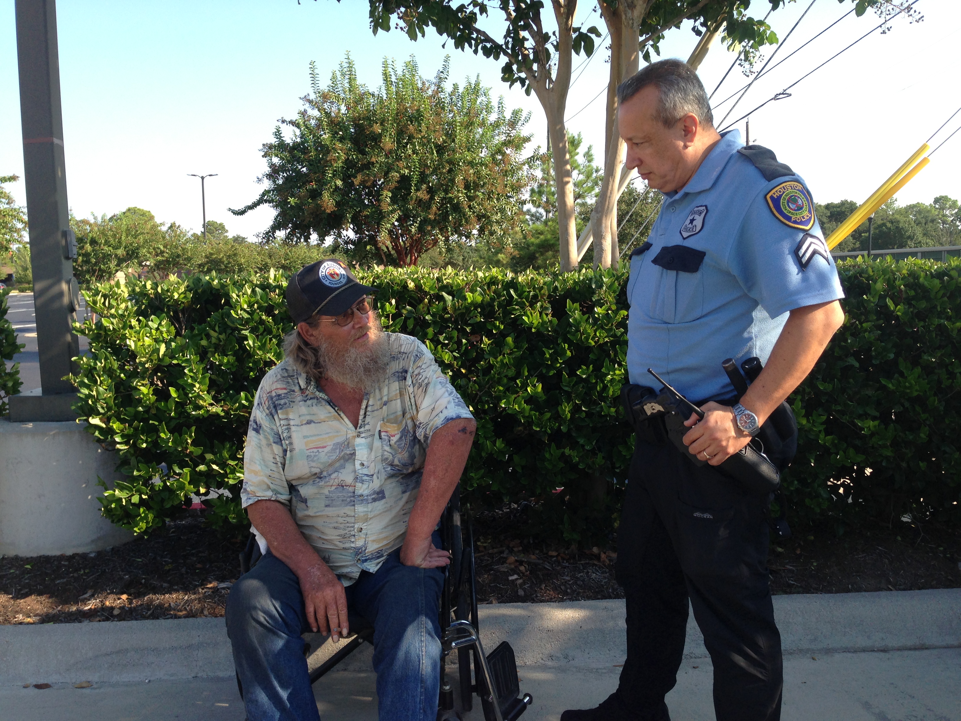 This morning, Officer Giraldo introduced me to Phil, a 64 year-old bearded man in a wheelchair. As we sat with Phil, I asked him to tell me his story. About a month ago, Phil set off from North Carolina on a cross-country trek in his wheelchair. He is traveling to El Paso. He told me about being robbed along the way, sleeping in his wheelchair, his two-blanket bed-roll that was stolen, and scooting along backwards holding his cardboard sign indicating his final destination.