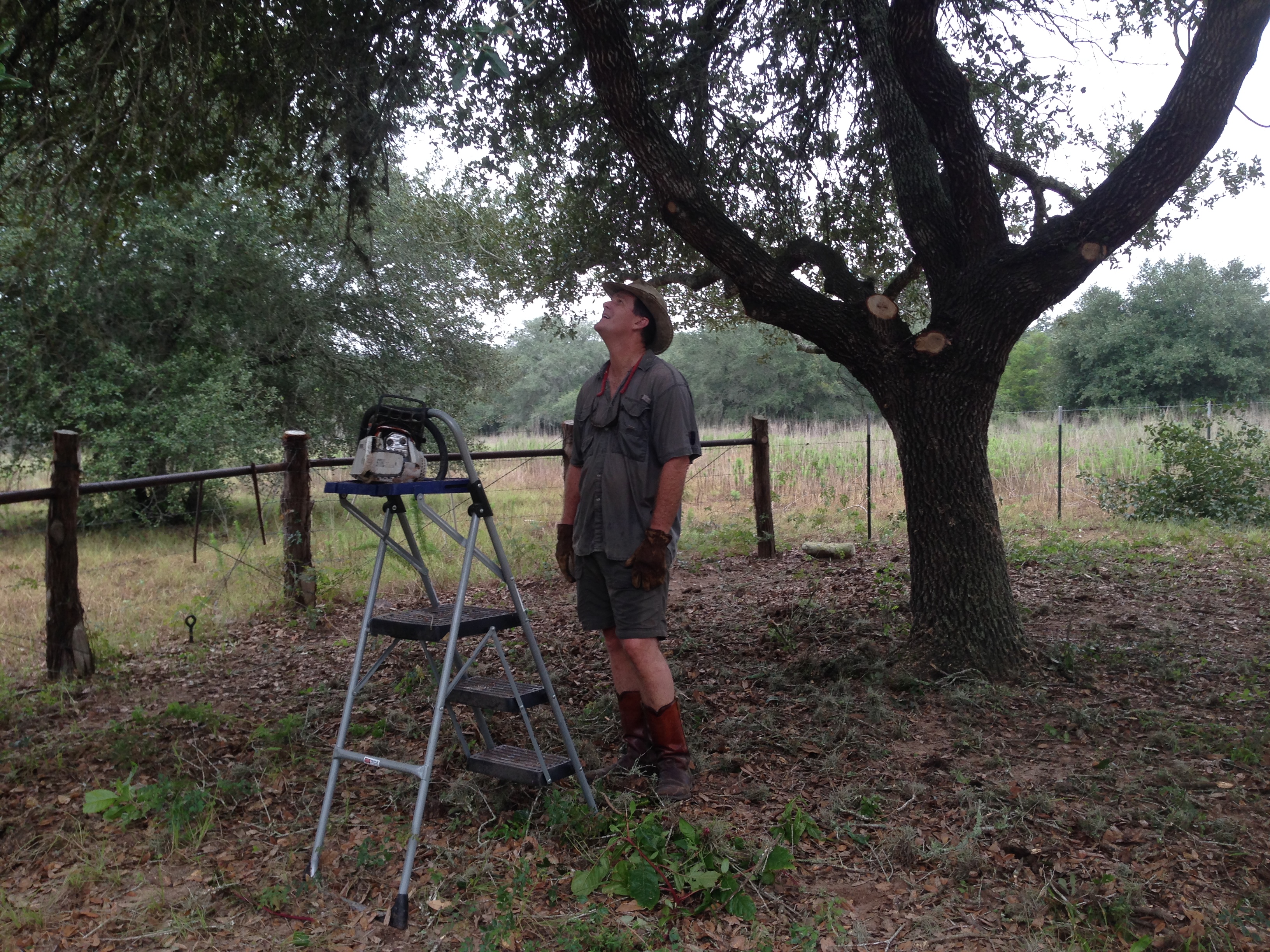 This past Saturday, my friend Bill Crenshaw and I drove to his property outside of Cat Spring to trim a tree. Bill’s place is graced by dozens of beautiful oak trees, most of which have never been trimmed. Bill wanted to tackle one tree in particular on the back of his property. The tree’s graceful lines were obscured by lots of growth and downward growing branches that were sucking vital nutrients from the main branches.