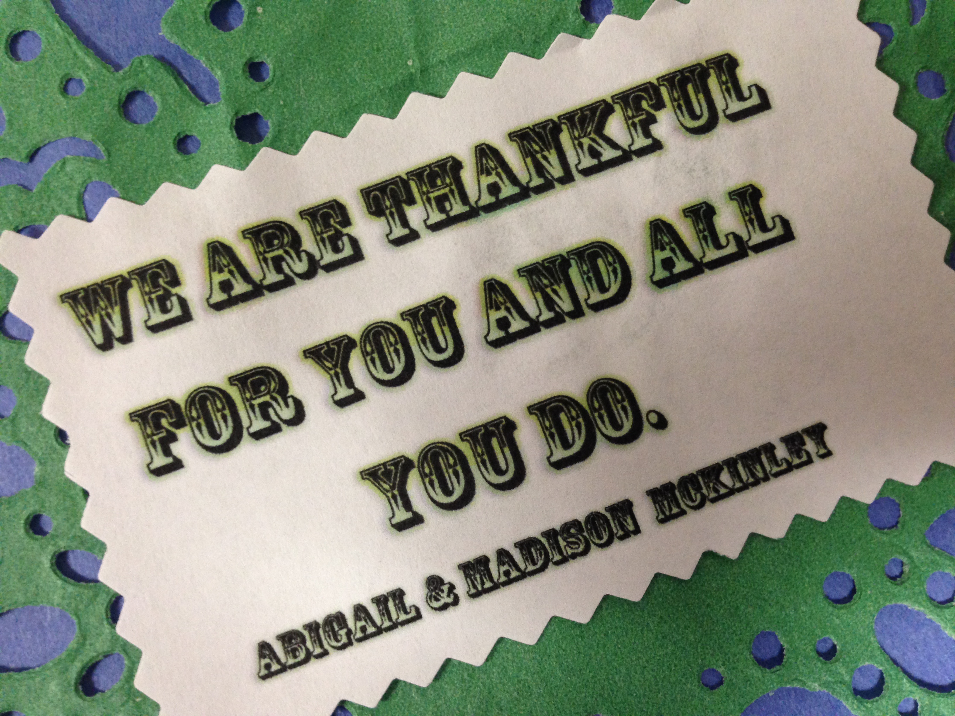 This morning, I added another note to my special treasury. Two sweet little girls named Abigail and Madison stopped by the church with their mom, Tiffany. They visited our offices and gave each of us a note that reads, “We Are Thankful For You And All You Do.” It seems like such a little thing — a handmade card delivered by two sisters. In reality, however, this simple act of kindness is a big thing.