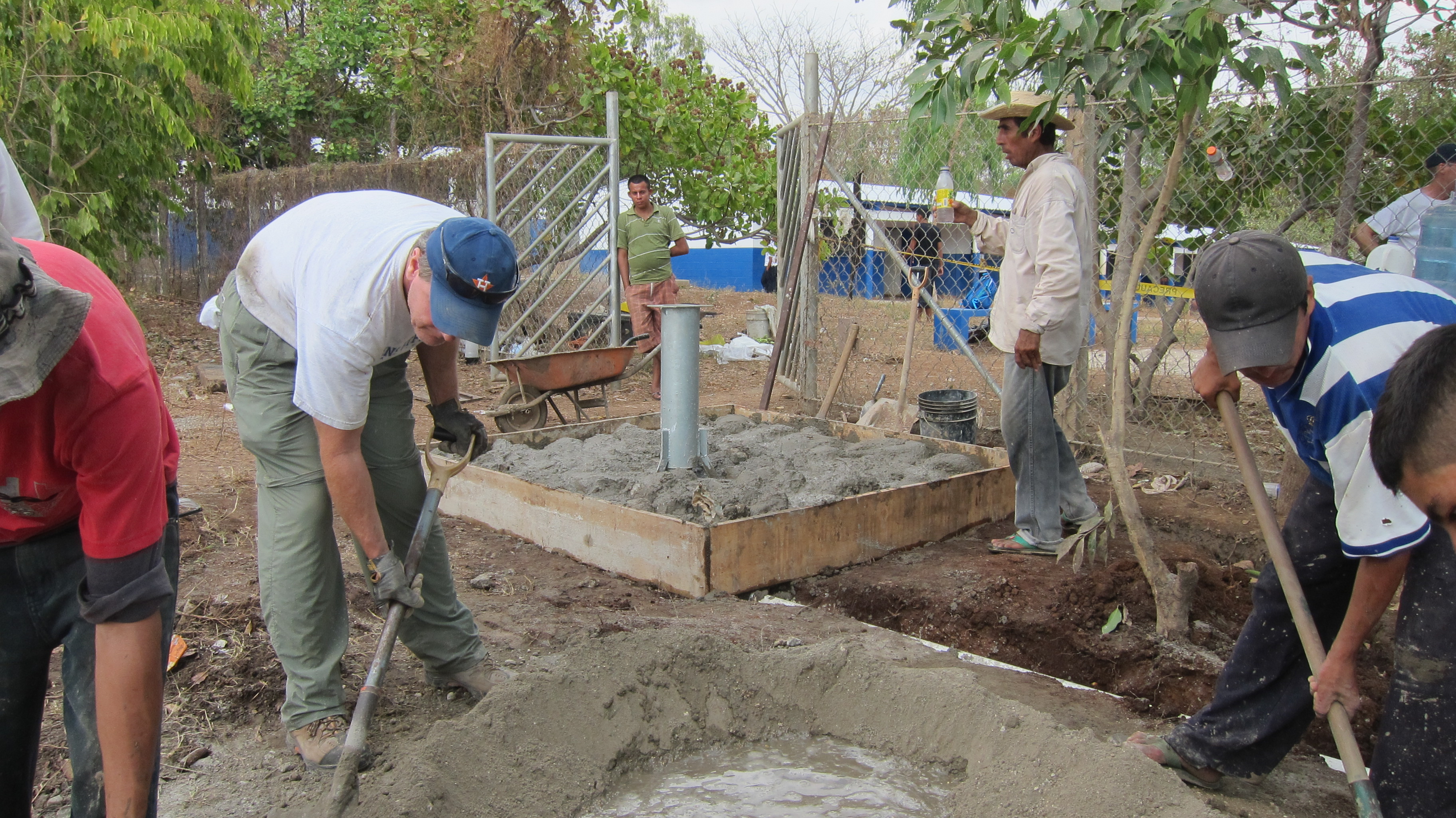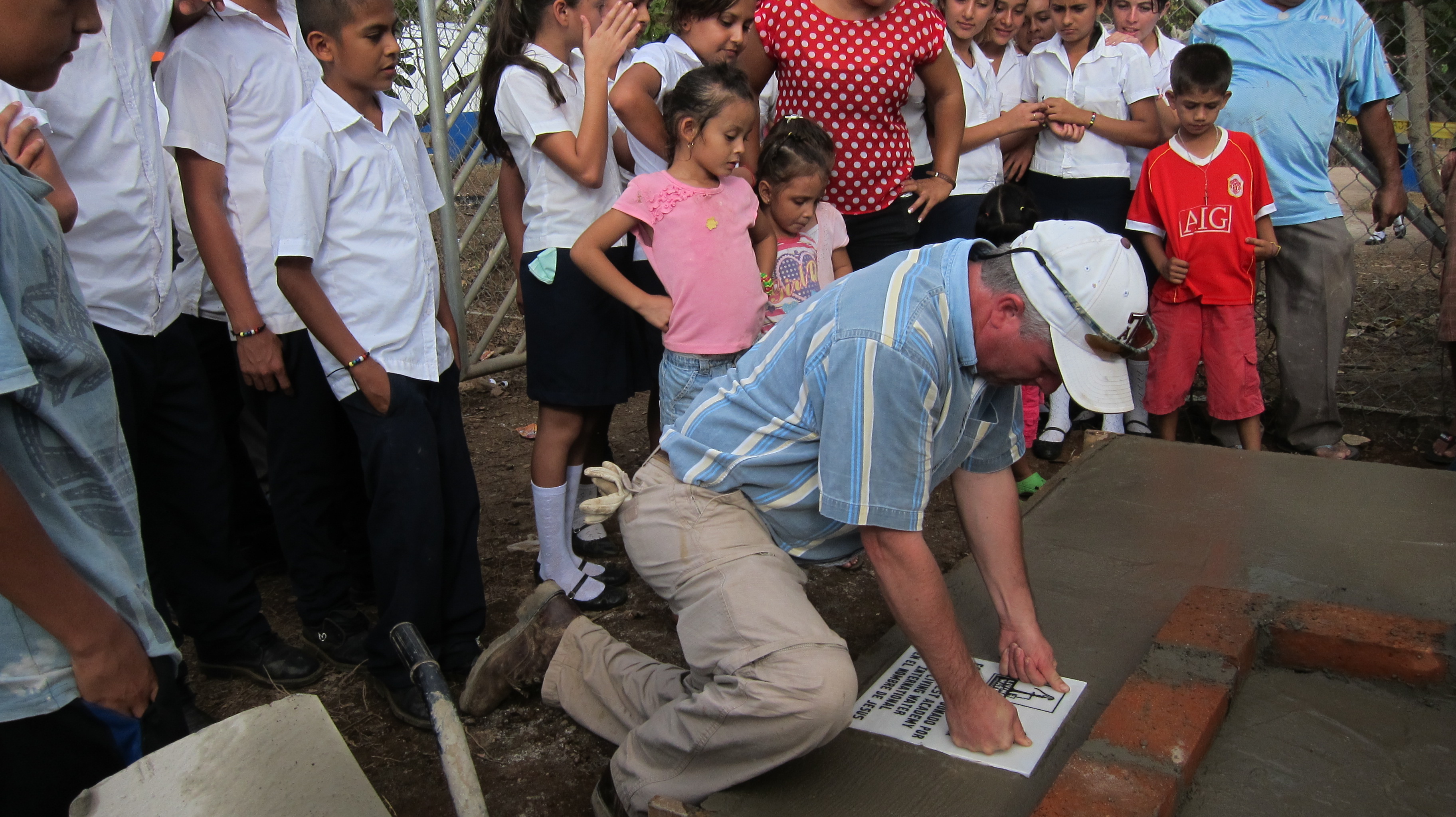 Jim Coleman set the dedication plaque into the pad. Our missions ministry funds the wells that we drill in Central America. However, this particular well was funded by the students at Faith West Academy where so many Kingsland kids attend school. The dedication plaque will serve as a reminder that students from Faith West gave this special gift to the children and families who call Valle Nuevo home.