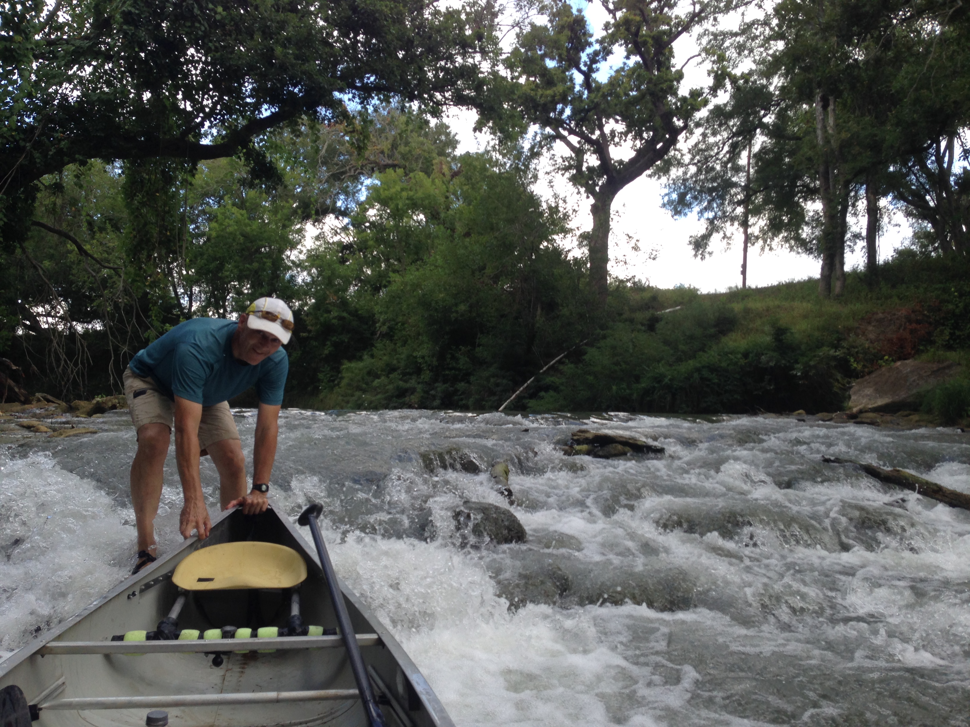 Ottine Dam is located a few miles down from the rapids. There is a required portage at this dam because it is deteriorating and dangerous. A paddler from San Marcos died here on a training run a few years ago. Thankfully, the dam is scheduled to be demolished. When we arrived at the dam we pulled our canoe up the sandy bank, dragged it around the dam, and then lowered it back down to the water. Once we hopped back into our canoe, the skies opened up and it rained on us all the way to Palmetto. No problem. The rain was refreshing.