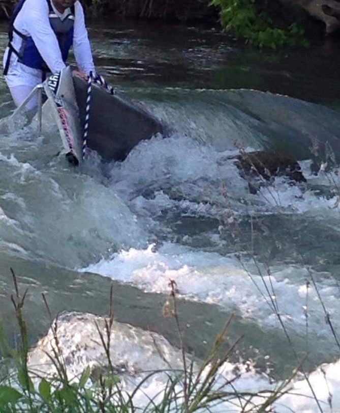 A couple of weeks ago, my son Jonathan and his safari partner paddled the first 40-miles of the course along the San Marcos. Jonathan called to caution me about a small set of rapids on the river in the vicinity of Prairie Lea, a small town near the river. Because the water was so low the last time I paddled this part of the river, this was a non-issue. Now, it is an issue. Another team that was doing a training run along this section had the misfortune of getting their canoe wrapped around a rock at these rapids.