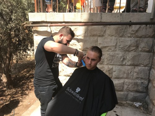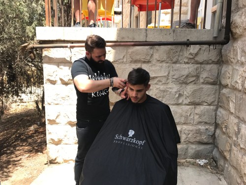 We invited him to join us at the place where we are staying in Amman to give haircuts to our team of fifty. This afternoon, half our team waited in line for haircuts and generously paid him for his services. He made enough money today to cover his rent for a month. Tomorrow, he will return to give haircuts to the rest of our team. He was so happy to work for his rent.