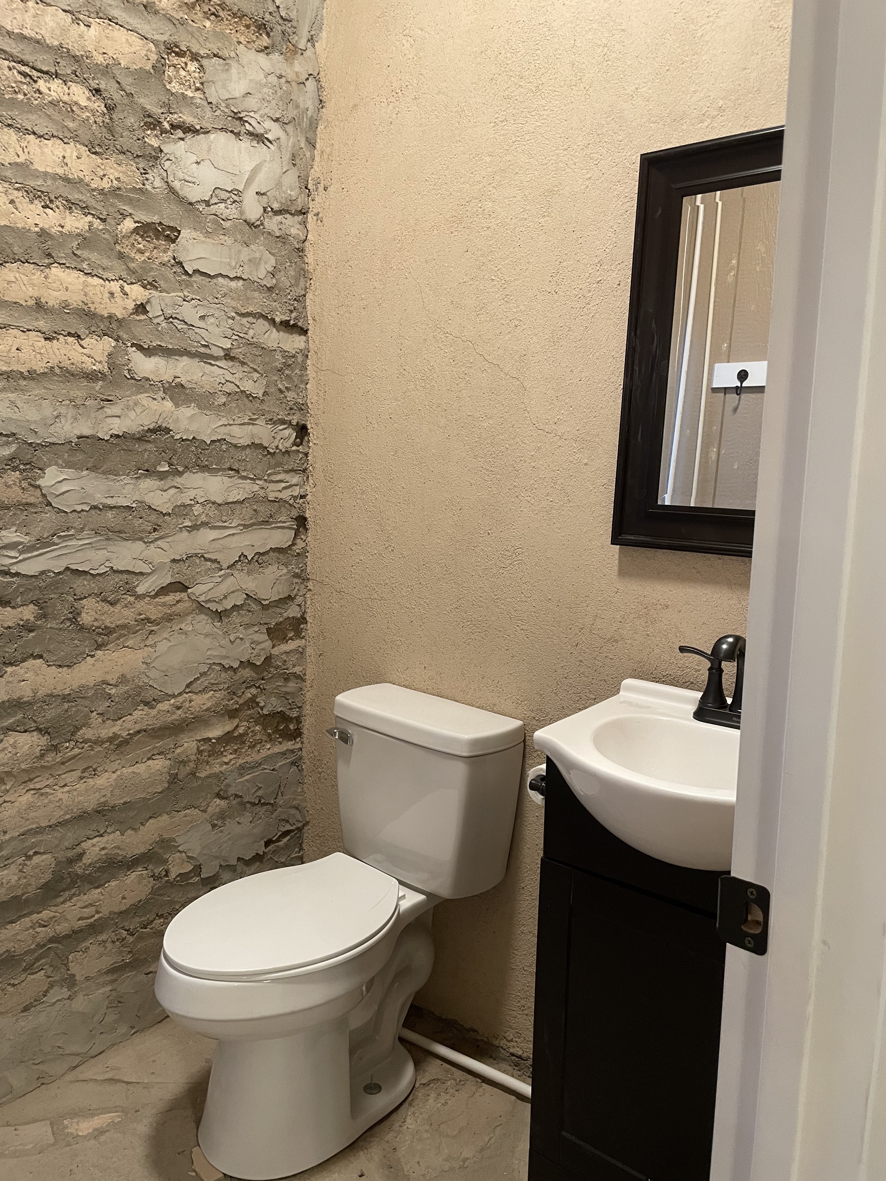 We remodeled the bathroom. This included moving a hot water on demand system, adding a new light, replacing the toilet and vanity, installing new siding, hanging a new door, and wiring a new light above the adjacent kitchen area.
