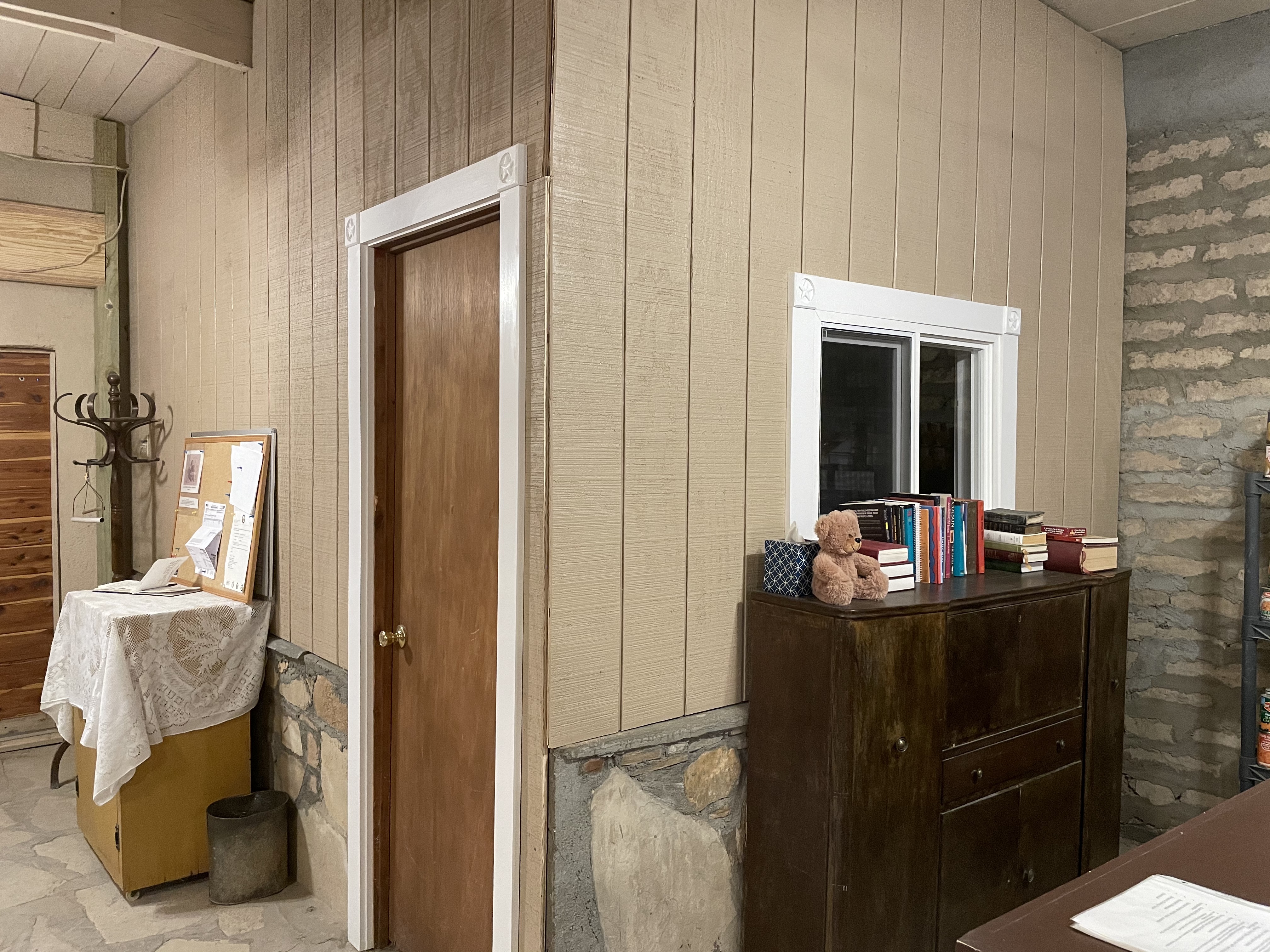 The small meeting room also got a much-needed facelift. We replaced the old paneling, added a horizontal sliding window to provide visual access to the room, reframed the door, and provided a small room air conditioner.