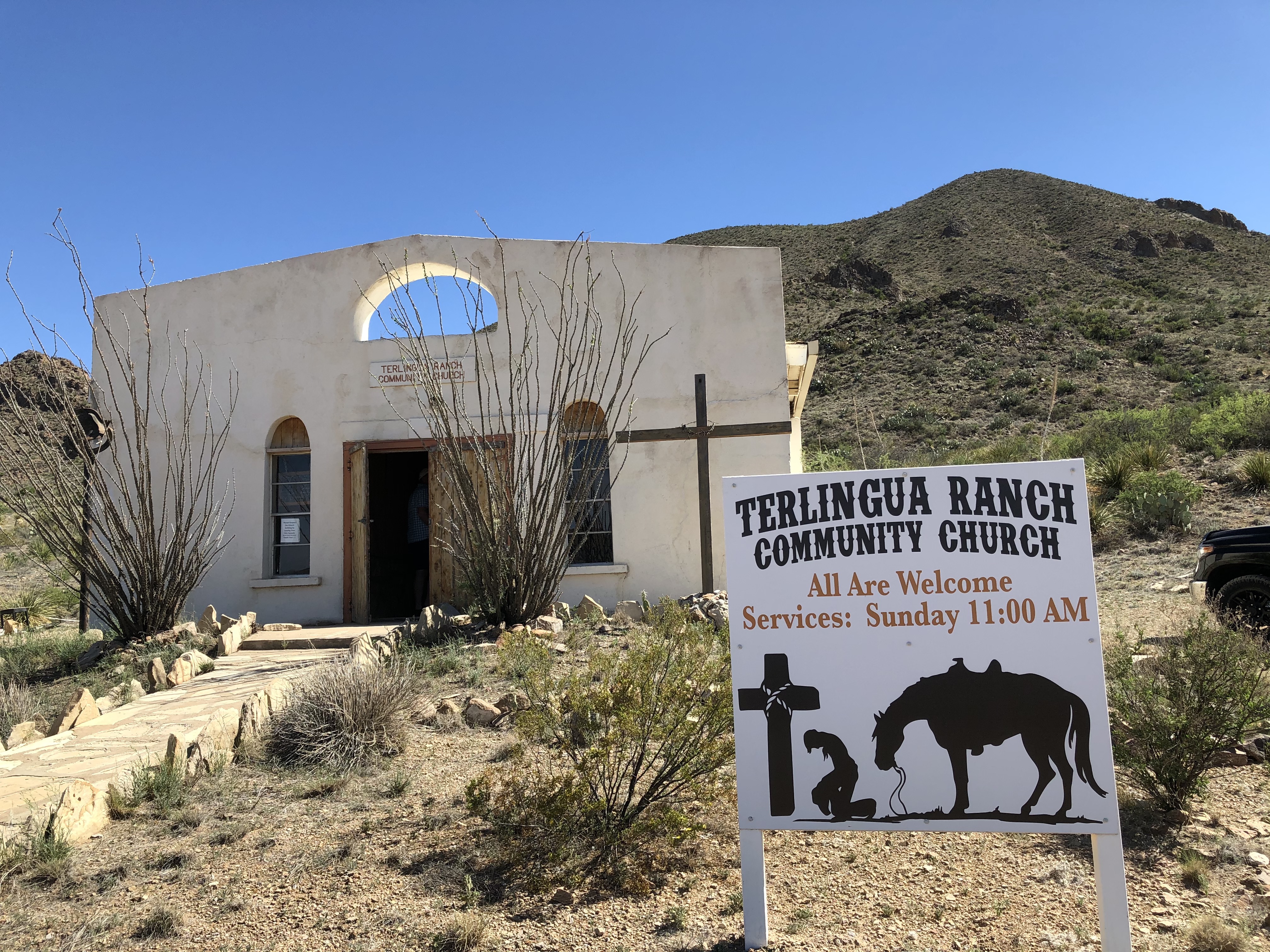 Terlingua Ranch Community Church is the only church on the ranch. The modest southwest styled church building is located at the foot of a rocky hill on Church Road about a mile from the Terlingua Ranch headquarters. The small parking lot can accommodate a few vehicles and the hitching posts a few horses.